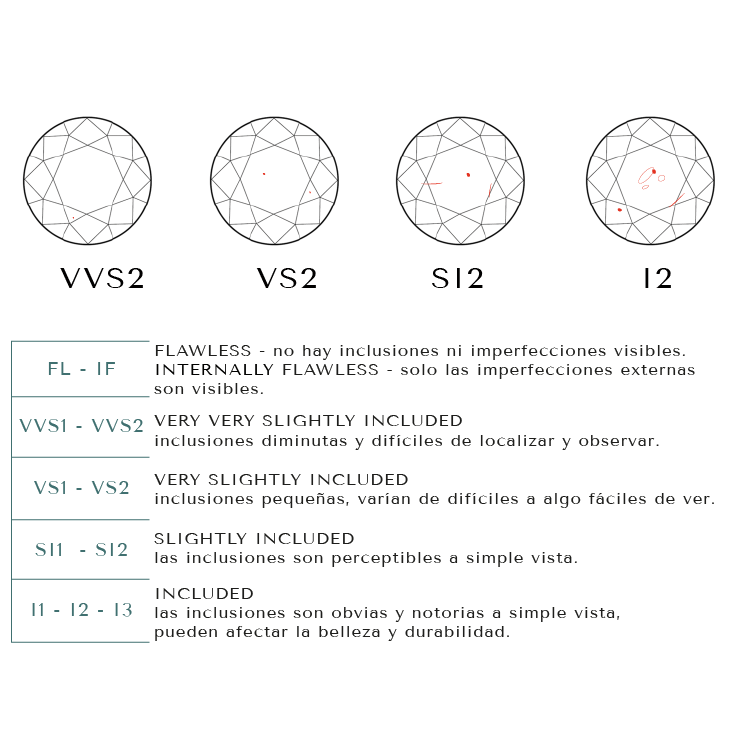 La escala clasifica un diamante completamente libre de imperfecciones, hasta un diamante con imperfecciones notorias a simple vista.