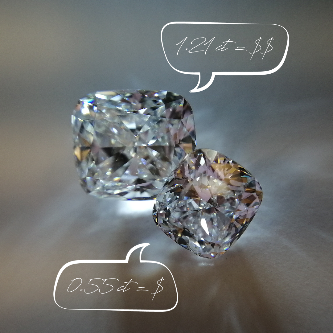 Seleccionar un diamante justo por debajo de estos pesos es una excelente manera ahorrar: la diferencia visual entre 0.90 y 1.00 quilates es mínima, y su precio varía considerablemente.